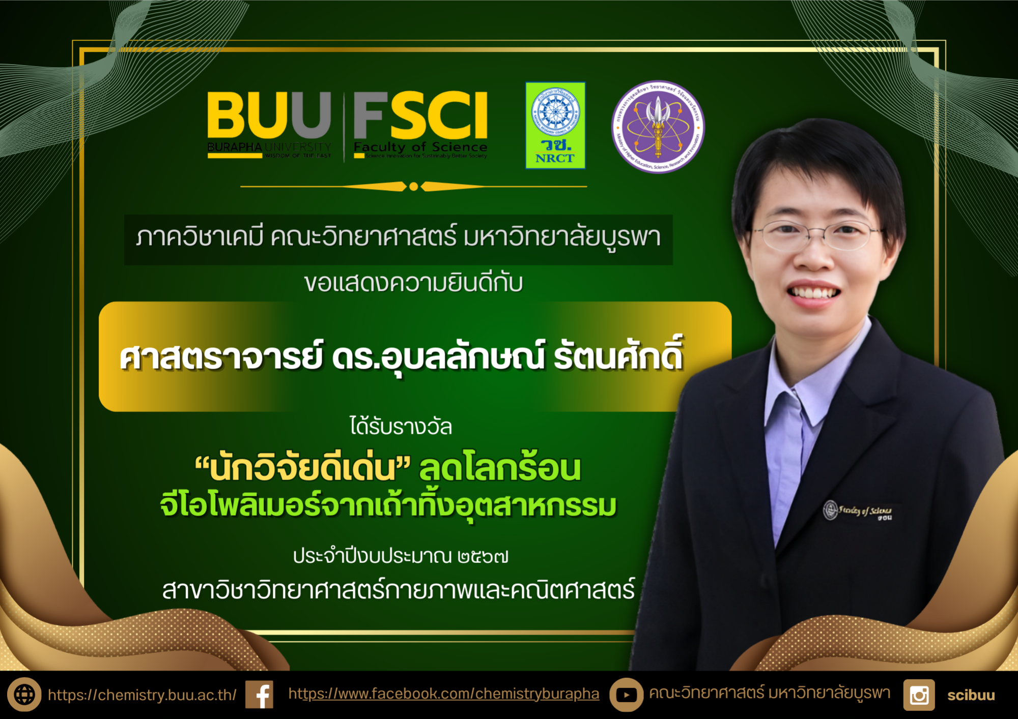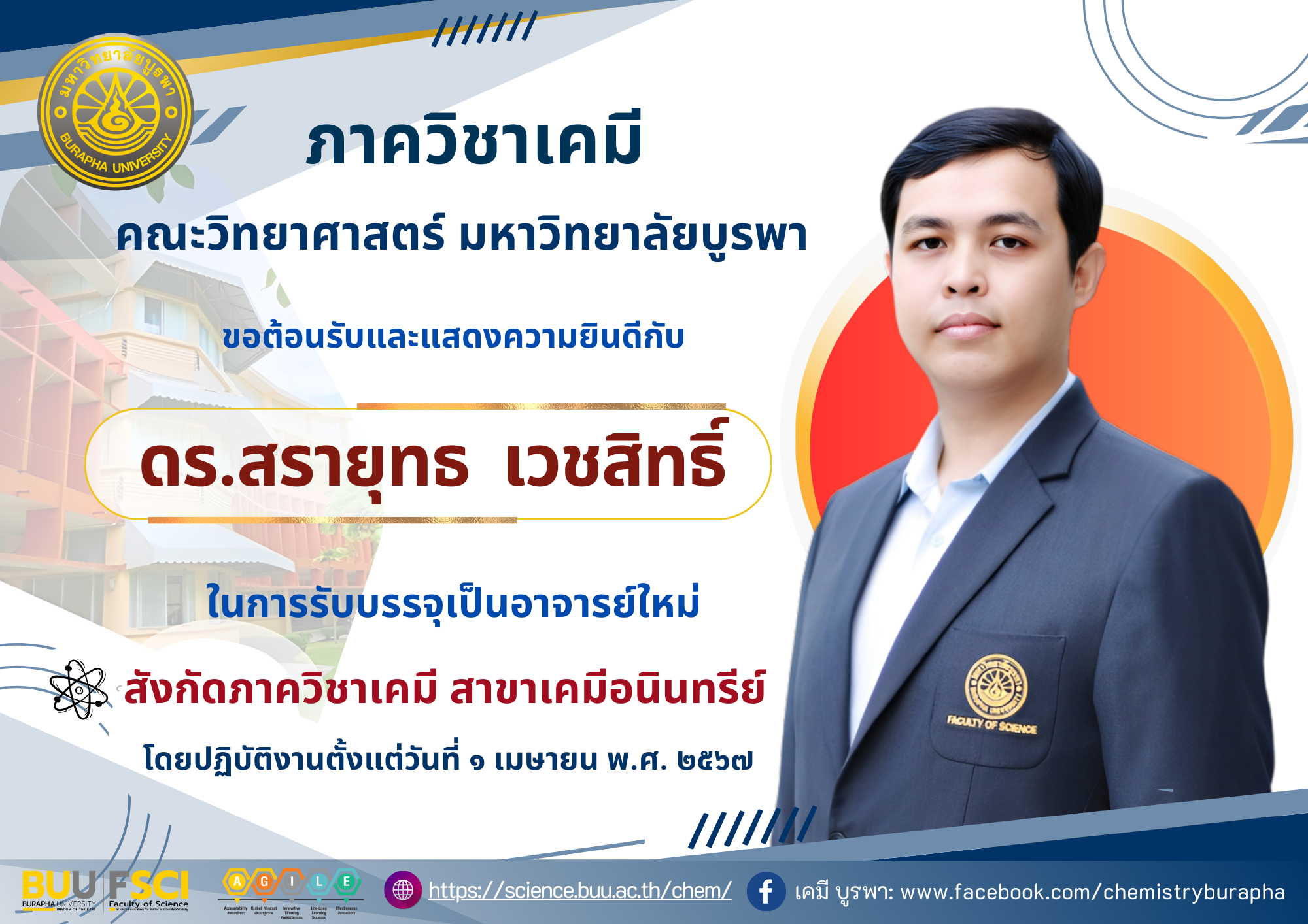 ภาควิชาเคมี คณะวิทยาศาสตร์ มหาวิทยาลัยบูรพาต้องขอขอบพระคุณท่านผู้อำนวยการศูนย์ทดสอบและมาตรวิทยา สถาบันวิจัยวิทยาศาสตร์และเทคโนโลยีแห่งประเทศไทย (วว.) และบุคลากรทุกท่านเป็นอย่างสูง